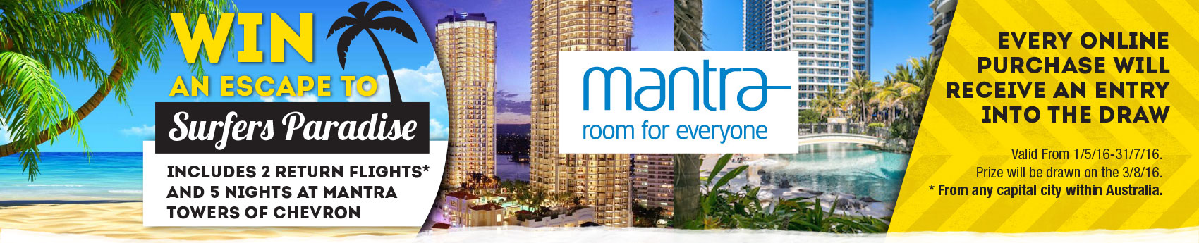 Buy online for a chance to win a trip Surfers Paradise, includes 2 returns flights and 5 nights at Mantra Towers of Chevron